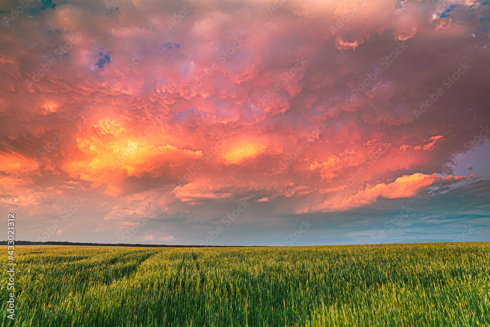 Sunset Dramatic Sky Over Rural Green Wheat Field. Spring Season. Altered Sunrise Sky
