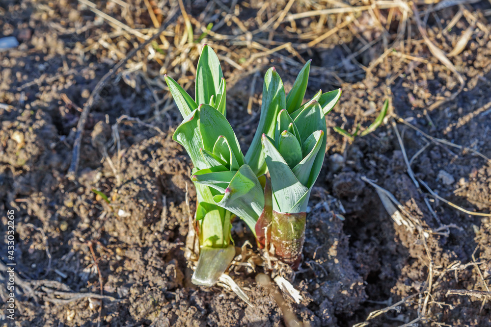 Young shoots of green onions in the rays of the setting sun close-up