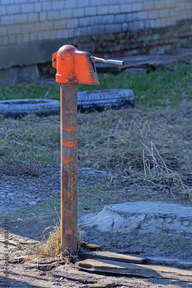 Old public hydrant on a village street close-up