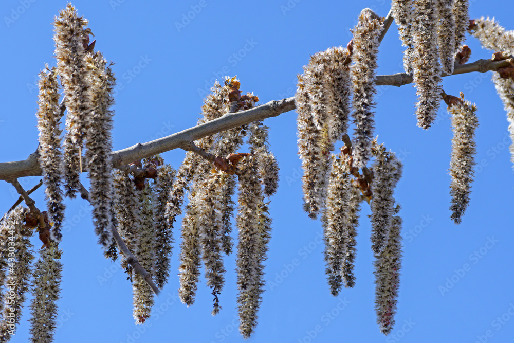 Alder branch with fluffy catkins against the blue sky