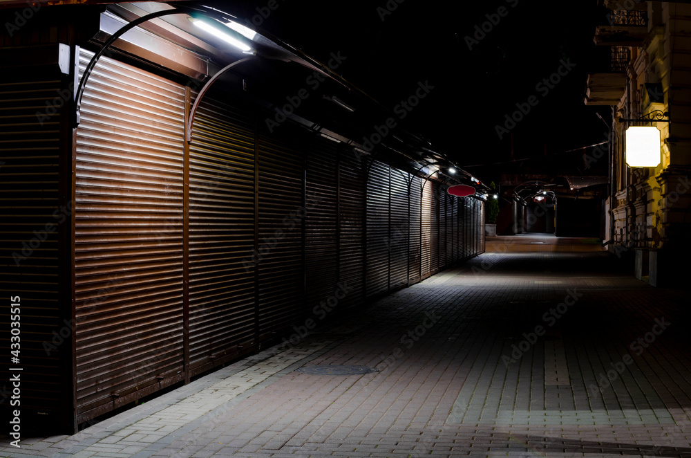 indoor empty street market steel roller shutters. night deserted lane. street vendors