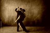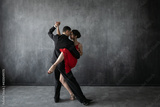 Couple of professional tango dancers in elegant suit and dress pose in a dancing movement on dark background. Attractive man and woman dance looking eye to eye.