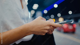 Close-up asian business girl stand outside terminal look smart phone check hotel booking wait car at domestic airport. Business commuter covid pandemic, Business travel social distancing concept.