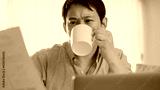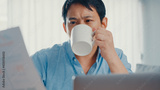 Freelance Asia guy casual wear using laptop and drink coffee in living room at house. Working from home, remotely work, distance education, social distancing, quarantine for corona virus prevention.