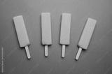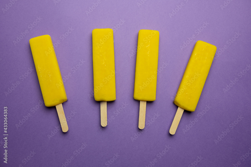 Yellow ice cream on a stick mango sorbet on a purple background. Summer dessert
