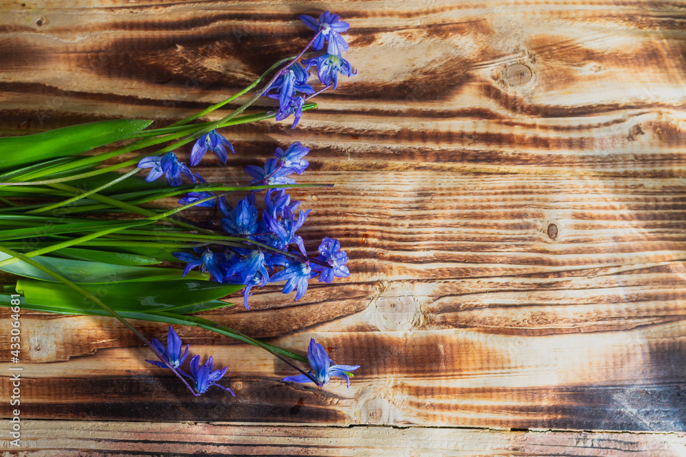 Blue spring early flowers on a natural wooden background in dewdrops