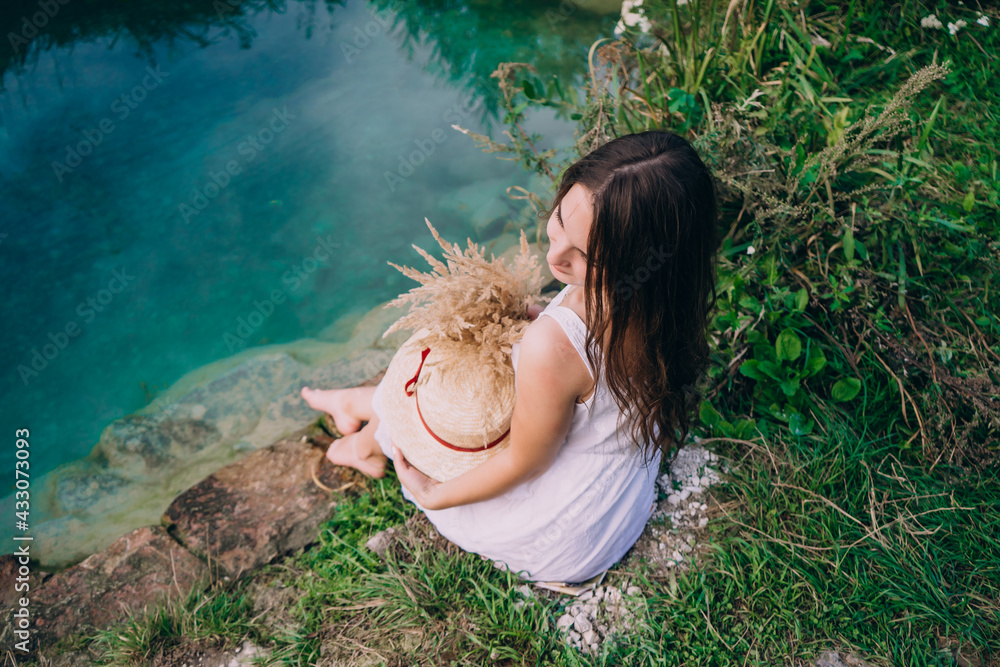 Young woman with bare feet sitting on the river bank. Brunette girl in a white dress near the lake with a bouquet of flowers.