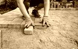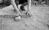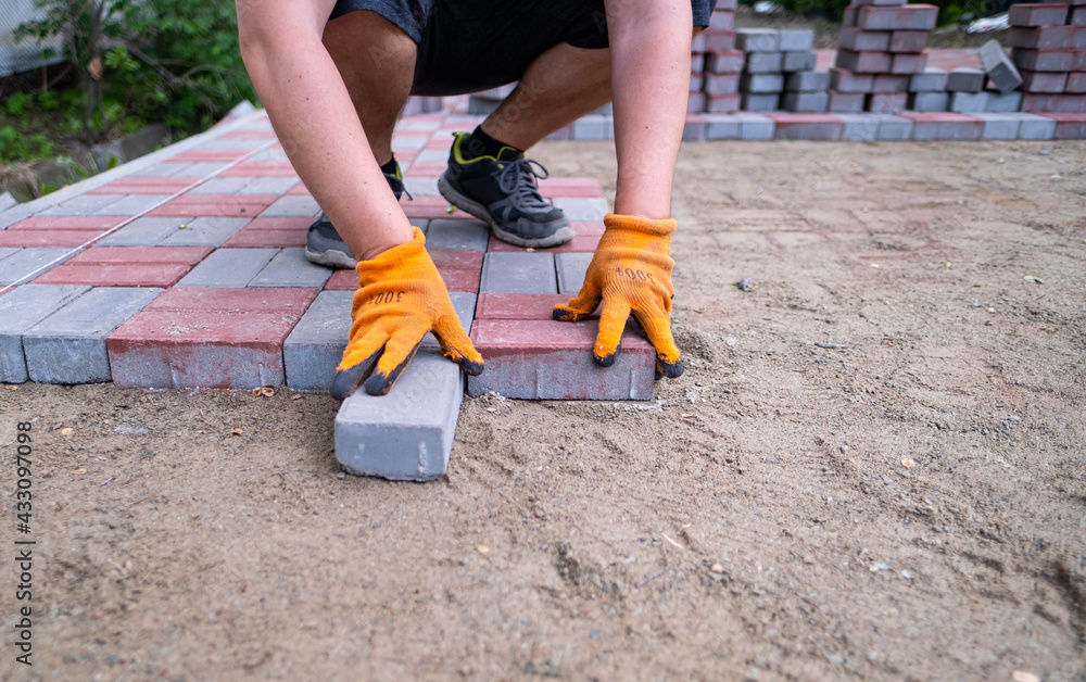 mason makes a pedestrian path. A worker is laying paving stones. The hands of a worker lay stones on the sand.