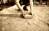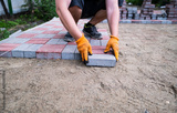 mason makes a pedestrian path. A worker is laying paving stones. The hands of a worker lay stones on the sand.