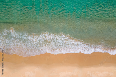 Aerial view of turquoise ocean wave reaching the coastline. Beautiful tropical beach from top view. Andaman sea in Thailand. Summer holiday vacation concept