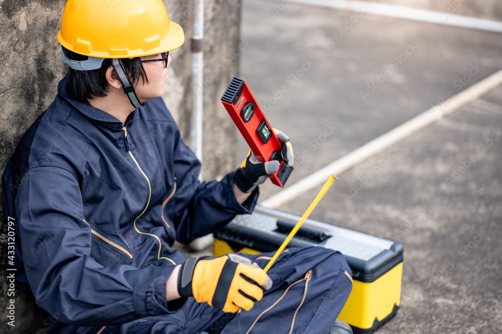 Maintenance worker man or male Asian mechanic wearing protective suit and helmet holding tape measure and level tool at construction site. Equipment for civil engineering project