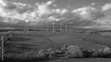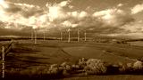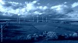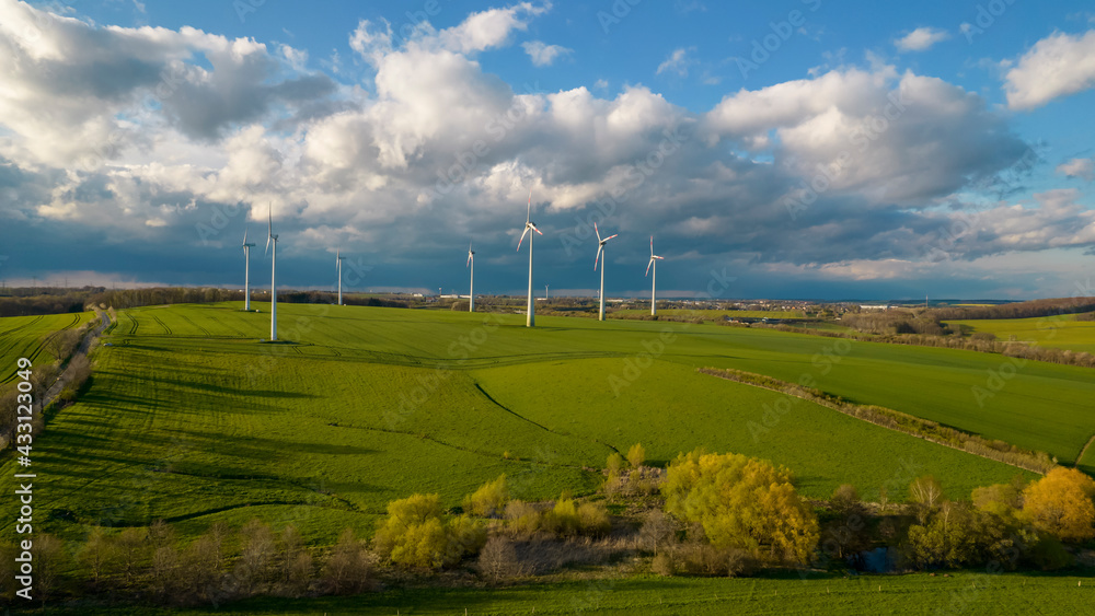 Luftbildaufnahme von Windkrafträdern auf einer grünen Wiese mit blauem Himmel und Wolken im Hintergrund
