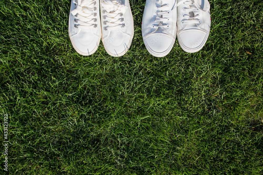 Women's and men's white sneakers on green grass. The guy and the girl are facing each other. View from above.