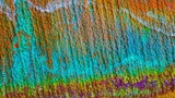 Oxidized copper, abstraction. Natural orange, blue. green yellow background with patina rusty copper plate