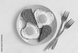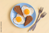 top view of two heart-shaped scrambled eggs with toasts, a pair of fried eggs on blue plate on beige background, romantic minimalistic design, healthy breakfast for sweetheart