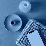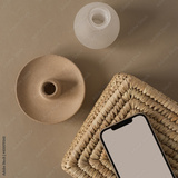 Flatlay of blank screen mobile phone on rattan casket and neutral beige background. Home office workspace. Lady, girl boss aesthetic business, work, app template mockup copy space. Flat lay, top view