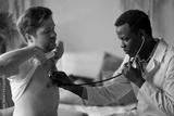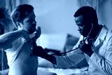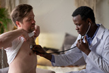 African doctor examining young male patient listening lungs and heart