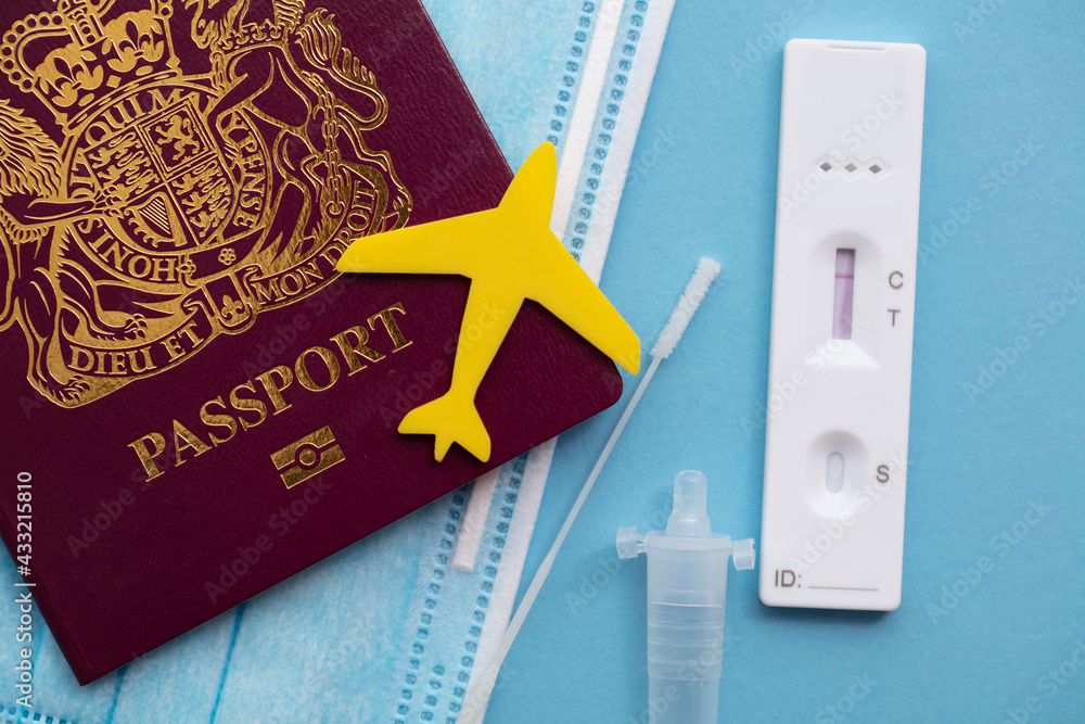 Coronavirus travel passport. Aeroplane on a passport with protective face mask