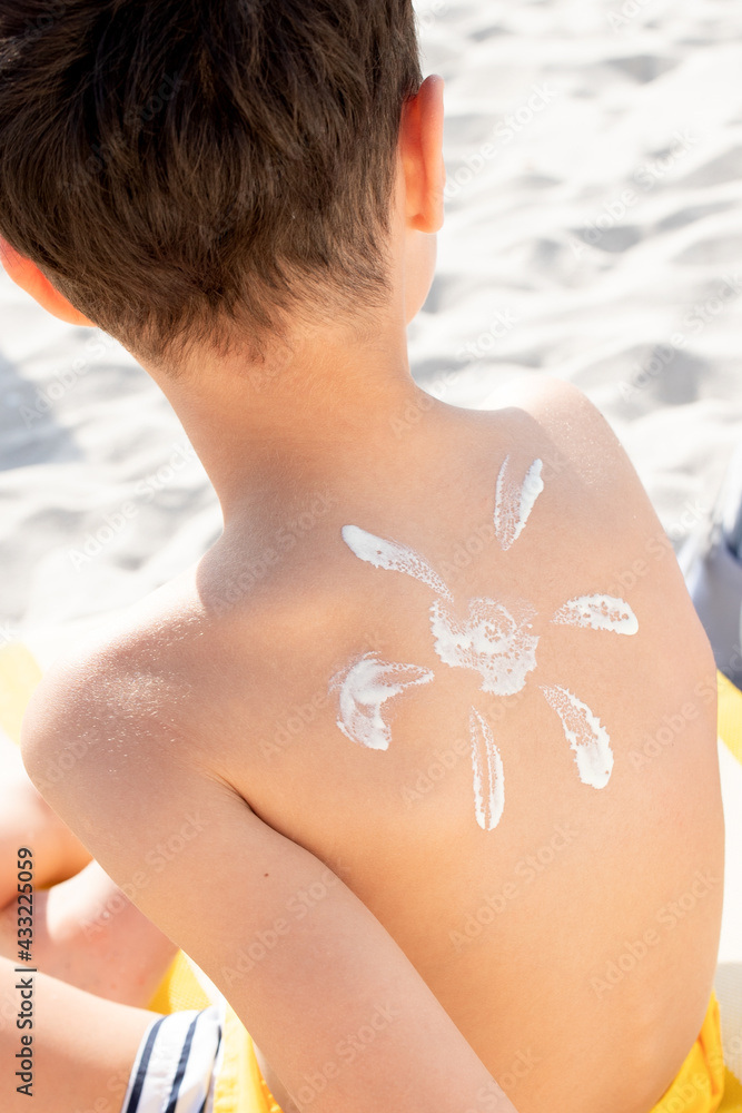 Sunblock is applied on child's back, the sun is painted with sunscreen. Concept of protection from the sun on the beach, smears with baby cream, prevention of sunburn. Health skin care. Tan. Summer.
