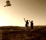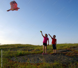 Happy kids boy and girl run with kite