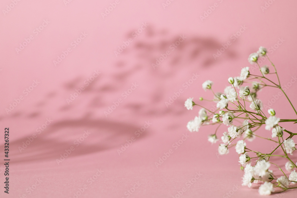 Small white flowers gypsophila on pastel pink background. Happy Women's Day, Wedding, Mother's Day, Easter, Valentine's Day. Flat lay, copy space