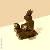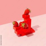 Ripe strawberries on red plastic toy bricks construction against pink background. Minimal summer fruit still life. Surreal futuristic fresh food concept.