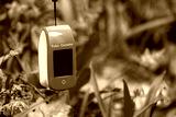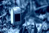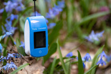 Pulse oximeter outdoors close-up with spring blue scilla flowers background. Blue oxygen saturation meter (SPO2) with empty screen and selective focus blur. Space for copy text