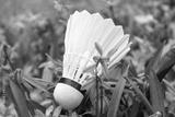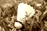 Badminton white feather shuttlecock close-up in spring blue scilla flowers lawn. Play sports activity outdoors on fresh air.