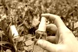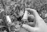 Hand spray clear liquid pump bottle in blooming spring flower lawn of blue Scilla bifolia (alpine squill, two-leaf squill). Two transparent triggers close-up