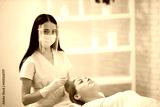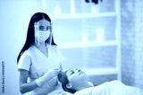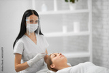 Side view of young beautician in white uniform and protective mask holding syringe and doing beauty injection for skin or hair. Concept of procedure for hair restoration and improvements growth.