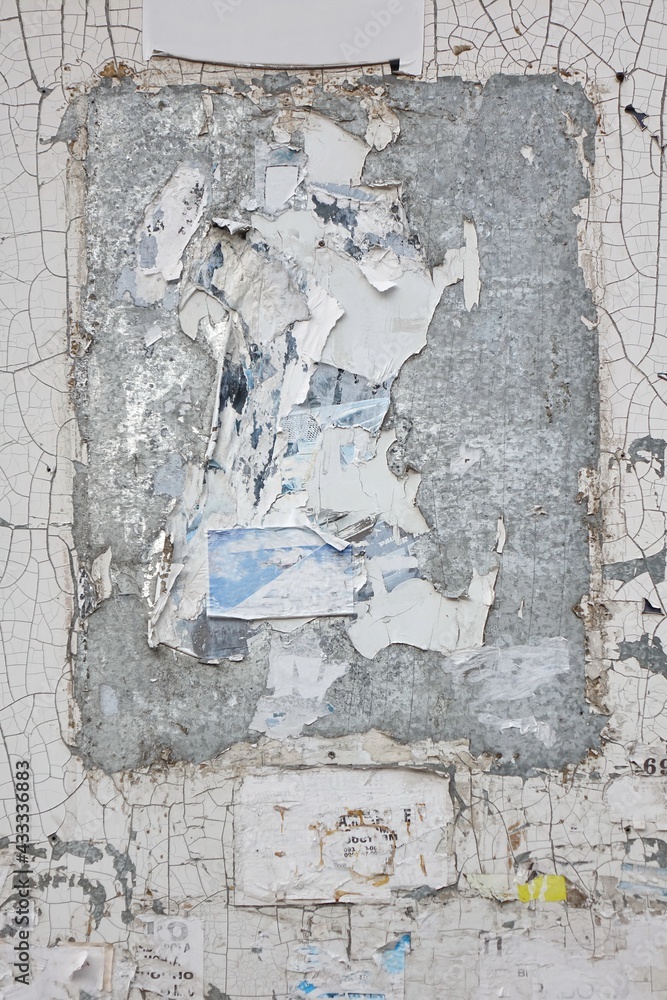 Vertical Old Wall Background With Torn Posters, Stickers and Advert.