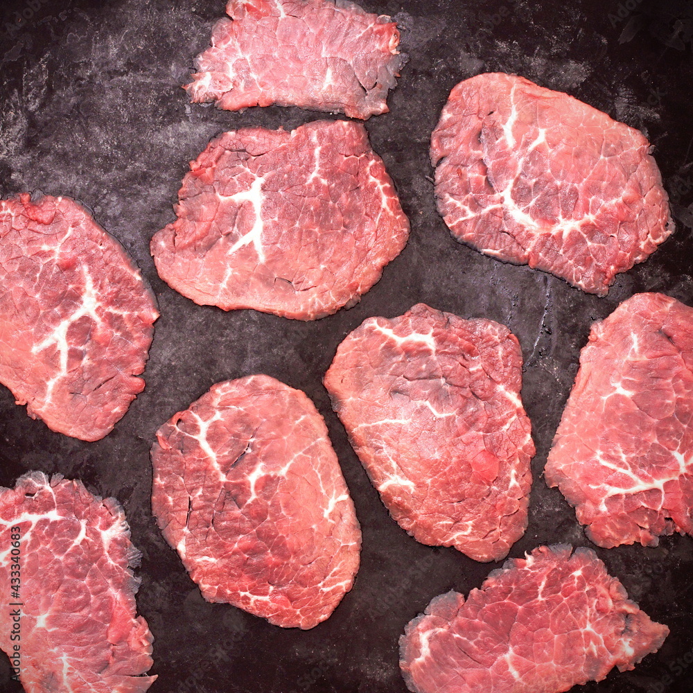 Carpaccio Top View On Black Shabby Background. Marbled Beef Carpaccio On Black Grunge Wooden Surface, Overhead View.