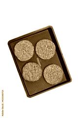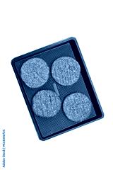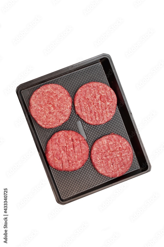 Minced Beef Raw Steak Burgers In Shop Plastic Tray Isolated on White Background, Overhead View. Uncooked Ground Meat Patties for Grilling. Burgers for BBQ Grill in Butcher Shop Container , Top View.
