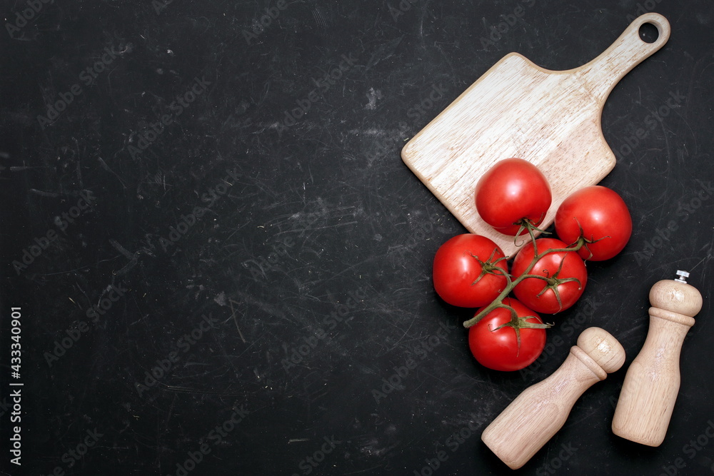 Ripe Red Tomatoes On Branch, Paper And Salt Mill On The White Wooden Cutting Board On Black Background.