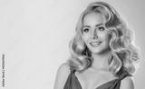 Blond Hair Model. Beauty Blonde Wavy Curly Hairstyle Woman Portrait. Luxury Hairdo for Middle Length Hair. Light Gray Background Copy Space