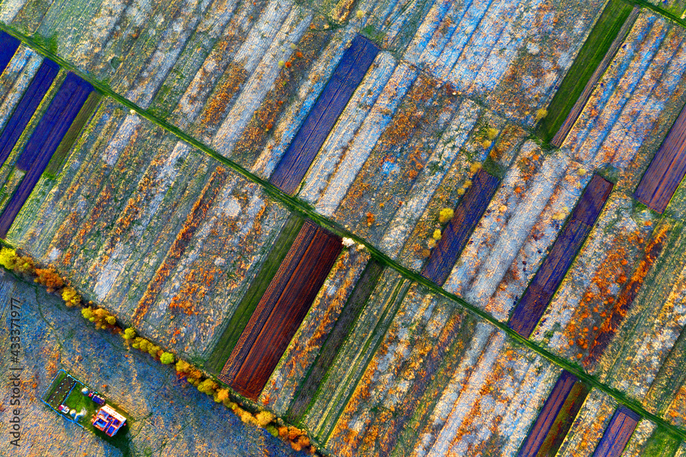 Aerial drone photo of flowering fields
