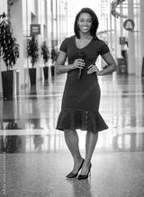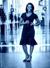 African American woman holding a microphone wearing a blue dress standing in a modern setting