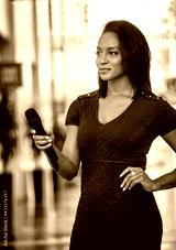 African American woman holding a microphone wearing a blue dress standing in a modern setting