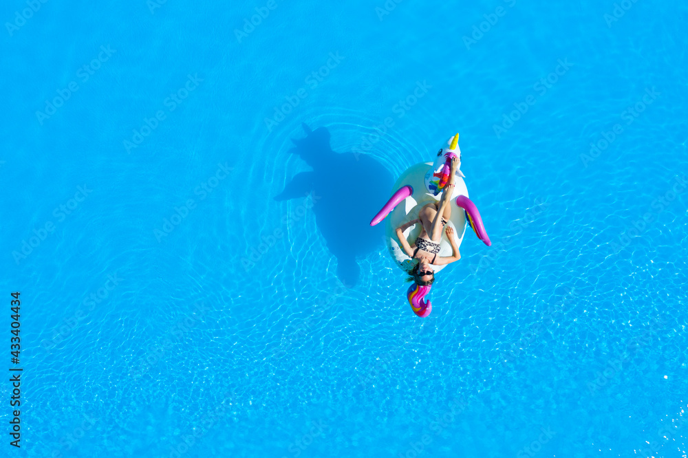 Top view of the pool with a girl in a swimsuit on an inflatable circle. Relaxing and tanning in the summer.
