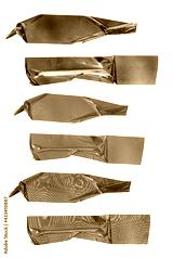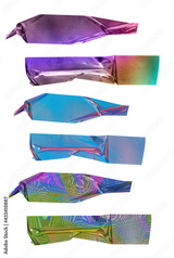 Shiny crumpled foil stickers. Cool set of metallic holographic sticky tape shapes isolated on white background.