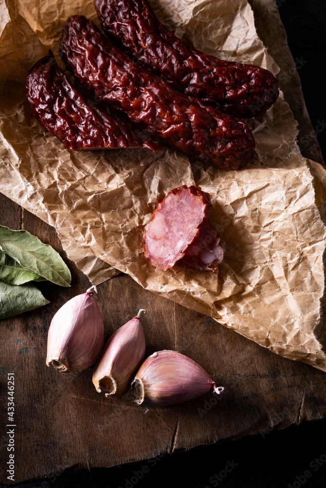 Vertical view of smoked dry sausage in a rustic composition with an old style, wooden cutting board, food wrapping paper, garlic and bay leaves. A Polish, homemade, country sausage.