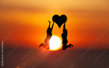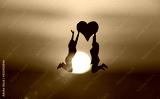 Zwei Frauen hüpfen mit einem Herz vor sonnenscheibe