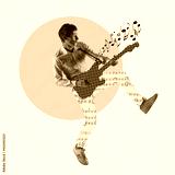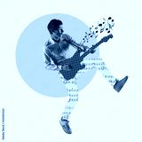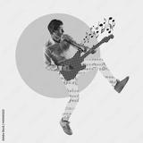 Contemporary art collage, modern design. Retro style. Stylish performer playing guitar on pastel color background