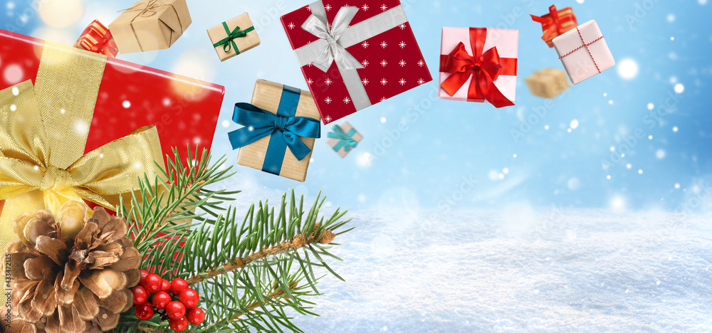 Christmas presents or New Year gifts on a blue snowy background. Card or invitation. Copy space