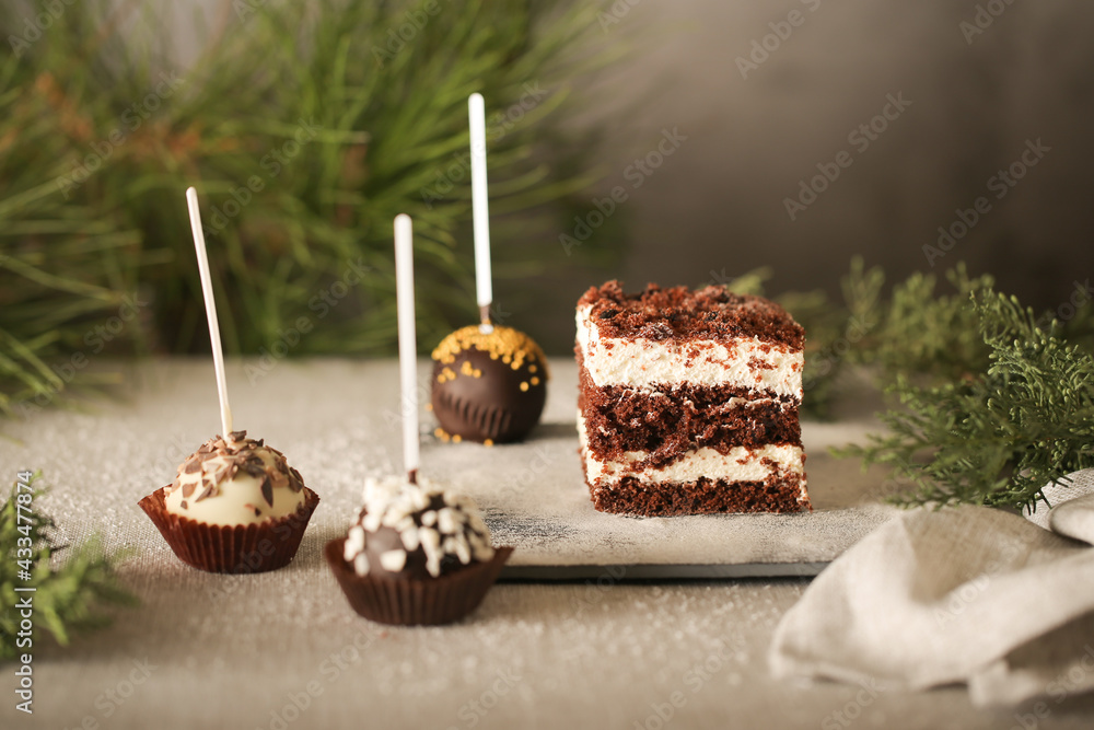 chocolate cake with cream is on the table