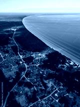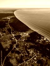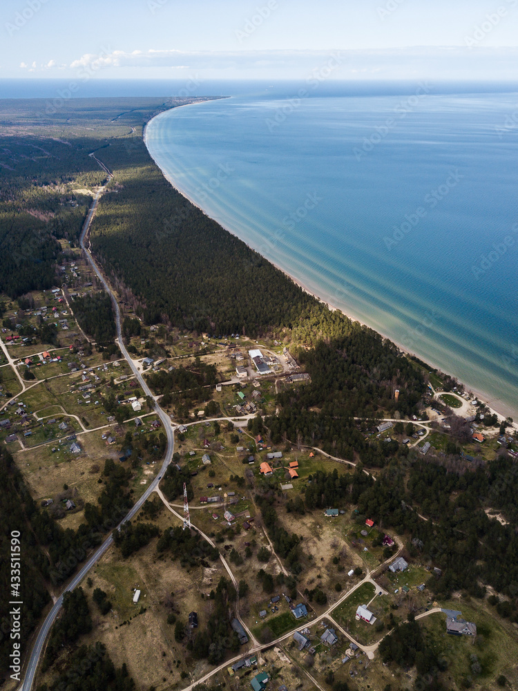 Aerial view of cape Kolka, Baltic sea and Melnsils village, Latvia.