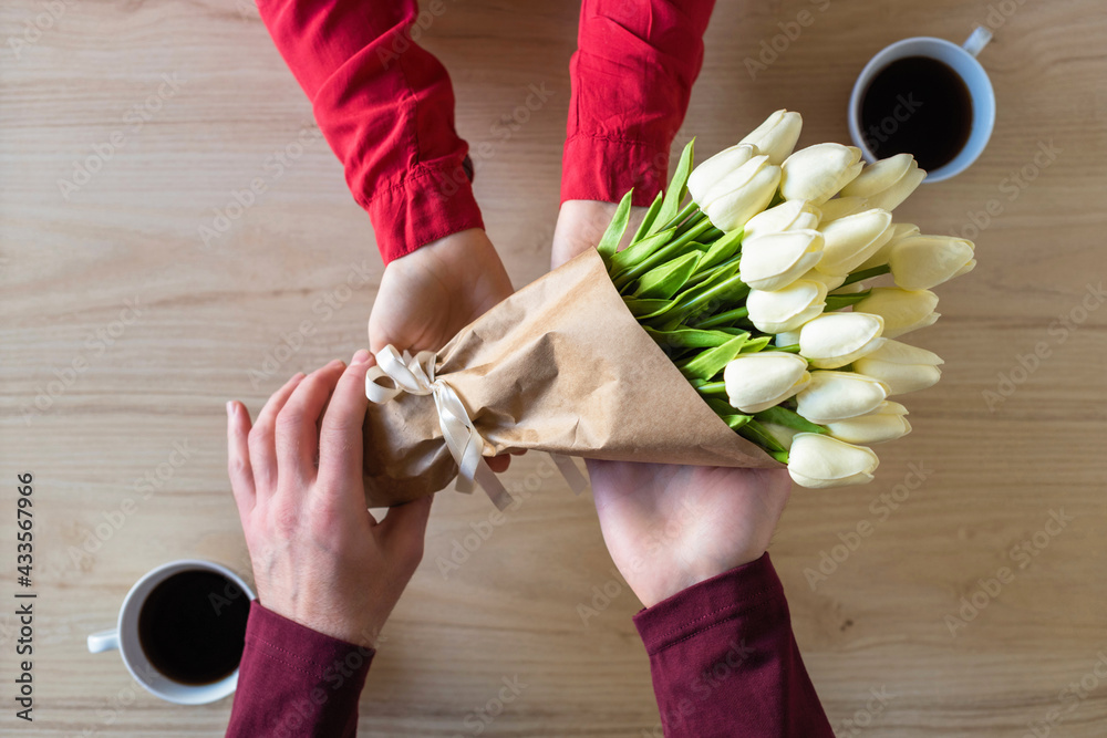 Valentines day. Close-up of woman and man celebrating in restaurant. Boyfriend giving bouquet of tulips to girlfriend. love, romance, date. Flat lay