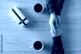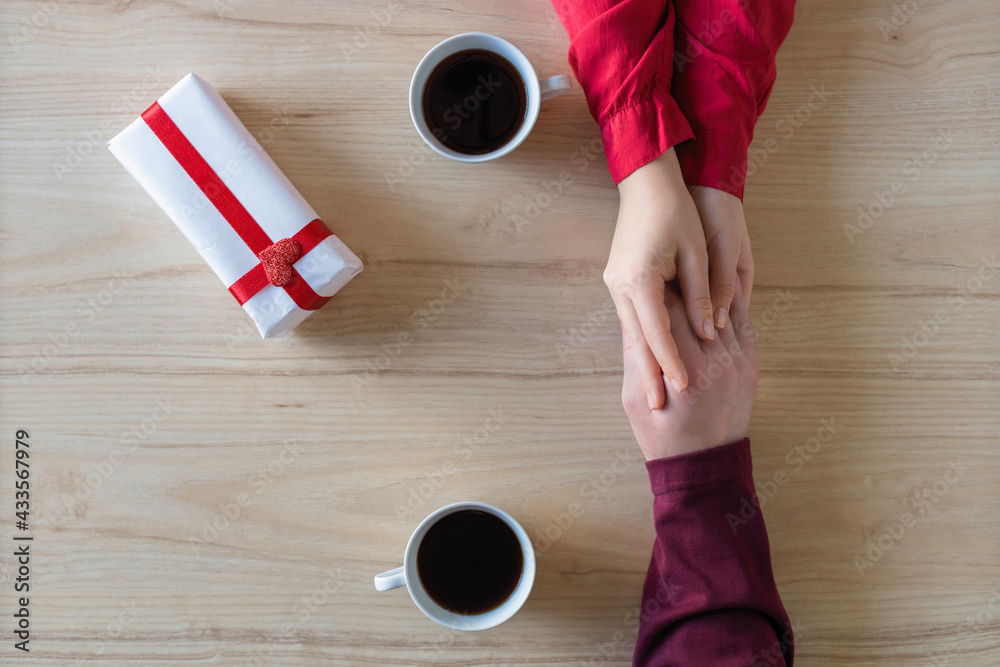 Valentines day. Close-up of woman and man celebrating in restaurant. Boyfriend giving small box gift to girlfriend. love, romance, date. Flat lay