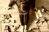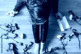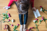 Unhappy woman sitting on the floor among scattered flowers and reading letter. Broken relationships in bad Valentine's day concept. Top view