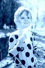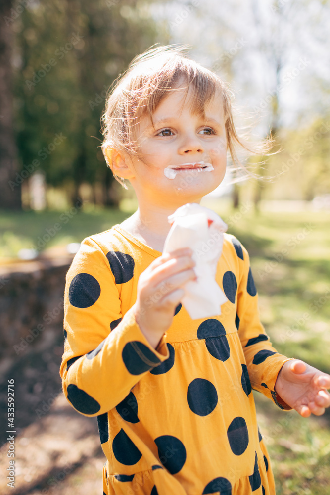 Little toddler girl eating ice cream. Healthy ice cream for kids. Melting ice cream on face